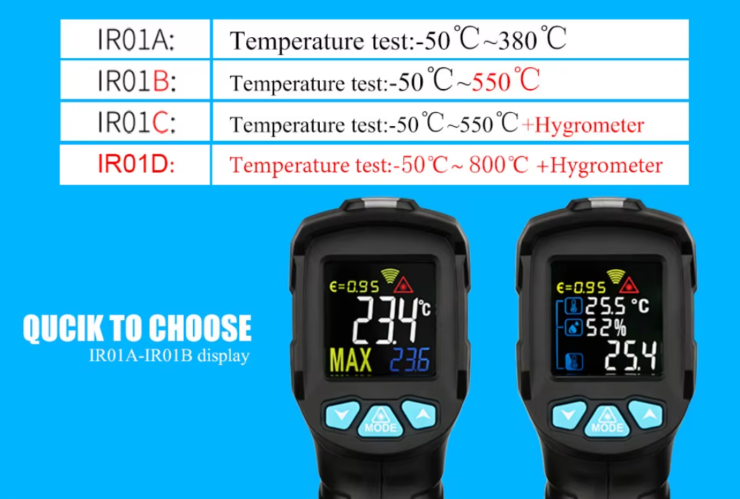 این مدل با نمایشگر رنگی LCD، آلارم حد دما، و قابلیت تنظیم ضریب تابش (Emissivity)، دقت بالایی در محیطهای صنعتی، تعمیرگاهی و آزمایشگاهی ارائه میدهد.