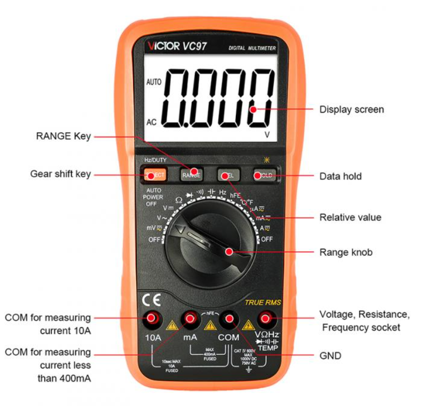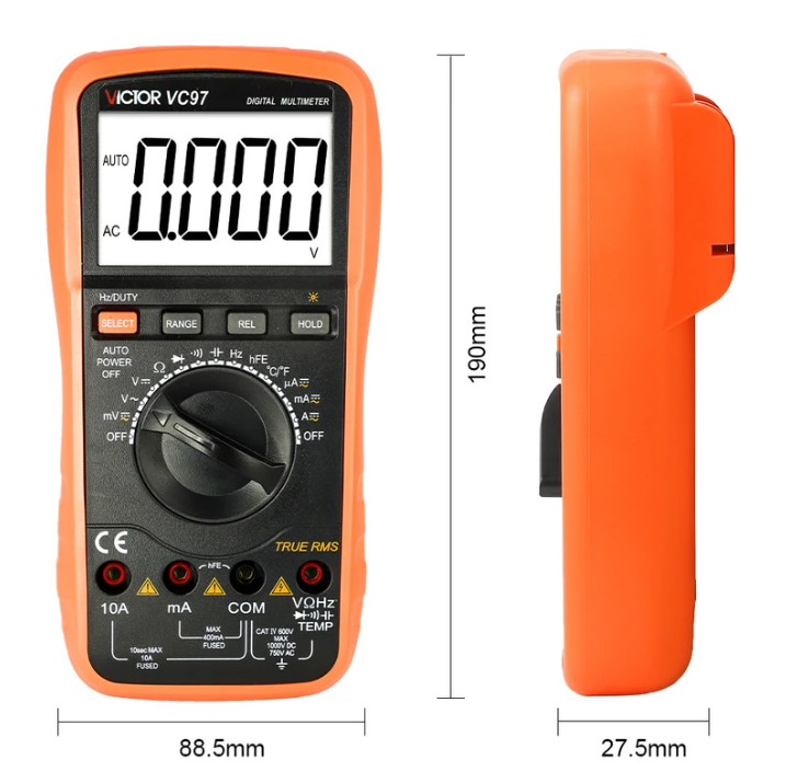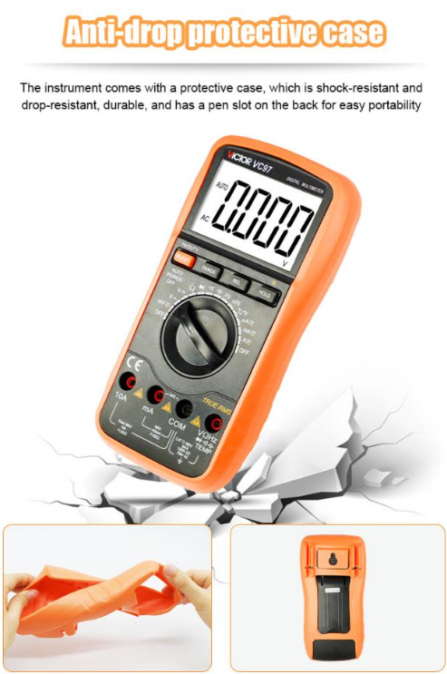 مولتیمتر دیجیتال دستی مدل VC97 دستگاهی پایدار و با عملکرد بالا است. قابلیت اندازهگیری ولتاژ و جریان AC/DC،مقاومت، ظرفیت خازنی، فرکانس، دما، تست ترانزیستور، دیود و پیوستگی (بوق) را دارد.این دستگاه از مبدل آنالوگ به دیجیتال نوع دوگانه (Dual-integral A/D converter) بهره میبرد و ابزاری دقیق و کاربردی برای استفاده در آزمایشگاه، کارخانه و محیطهای خانگی است.مولتیمتر VC97 به یک نمایشگر 42 میلیمتری مجهز است و انرژی خود را از باتری تأمین میکند. طراحی آن مبتنی بر مدار مجتمع (IC) بوده و مطابق با استاندارد ایمنی IEC1010 ساخته شده است، که ایمنی و دقت عملکرد آن را تضمین میکند.
