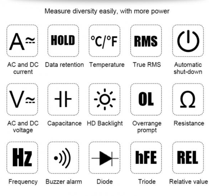 | 10MΩ | 3times/s | 40Hz~400Hz | Auto Range/Manual Range | 3999 | 50mm×70mm | 1%~99.% |