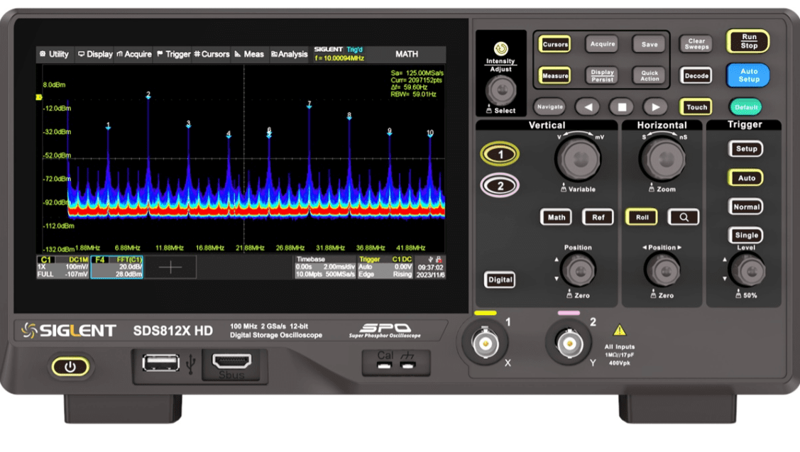 Siglent SDS812X HD از فناوری SPO Siglent با حداکثر نرخ ضبط شکل موج تا 120000 wfm/s حالت عادی، (تا 500000 wfm/s در حالت متوالی)، عملکرد نمایش درجهبندی شدت سطح 256 بهعلاوه حالت نمایش دمای رنگ استفاده میکند.