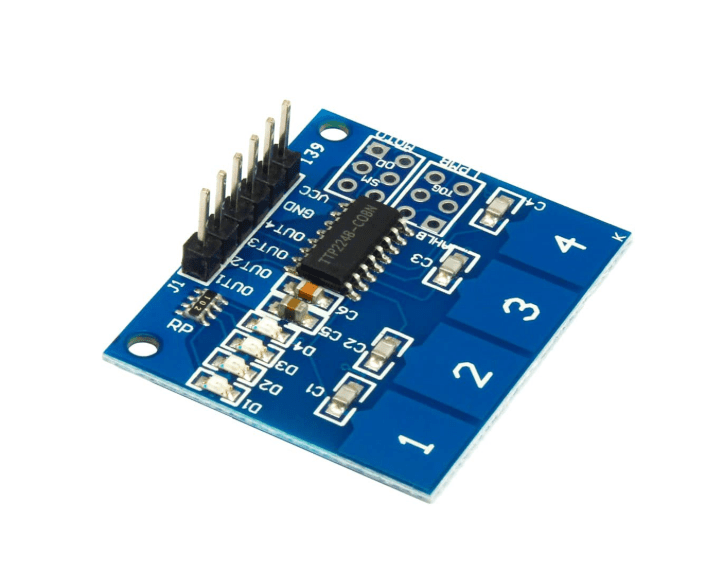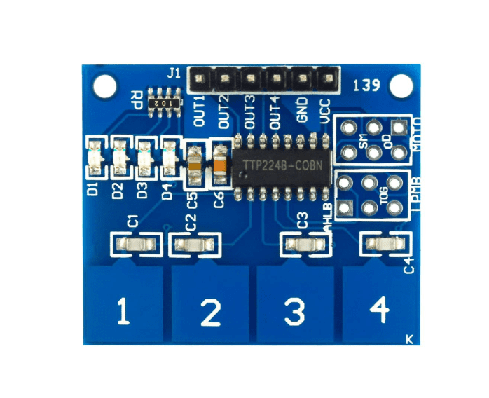 این ماژول لمس خازنی یک حسگر لمسی با 4 پد لمسی است که بر پایه چیپ TTP224 ساخته شده است. هر پد به یک ورودی از چیپ TTP224 متصل است و به صورت موازی با یک خازن قرار دارد. این طراحی باعث تشخیص دقیق لمس میشود.