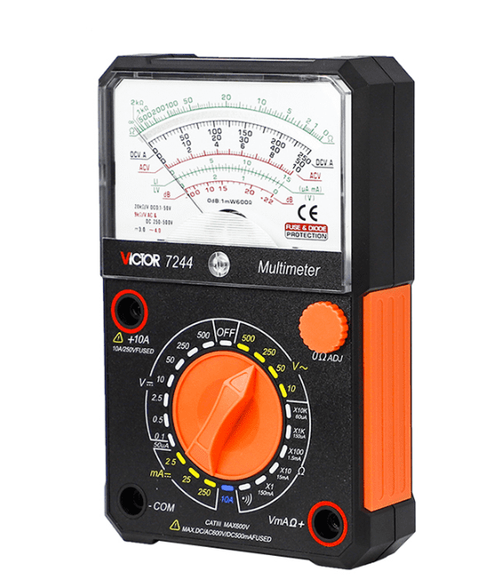مولتیمتر آنالوگ دستی مدل 7244 دستگاهی بادقت بالا است.قابلیت اندازهگیری این مولتیمتر دارای ۲۱ رنج اندازهگیری بوده و میتواند ولتاژ DC، ولتاژ AC، جریان DC، مقاومت را اندازهگیری کند و همچنین دارای عملکرد بیزر تداوم (تست اتصال کوتاه) میباشد.این مولتیمتر آنالوگ مطابق با استاندارد EN61010 و استاندارد فوقولتاژ CAT III 600V طراحی شده است.
