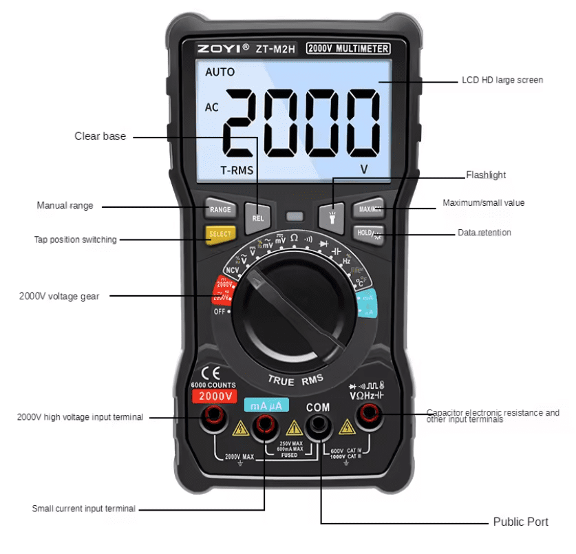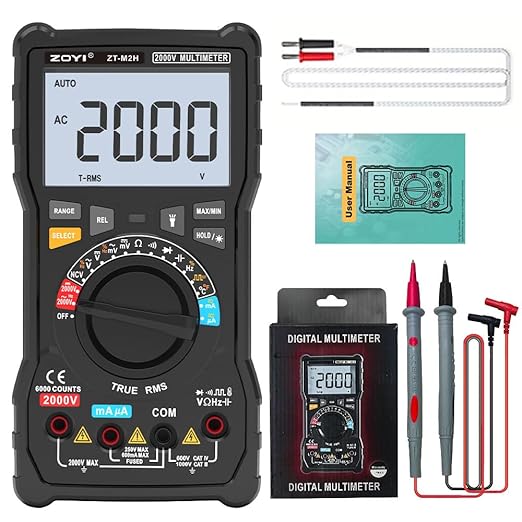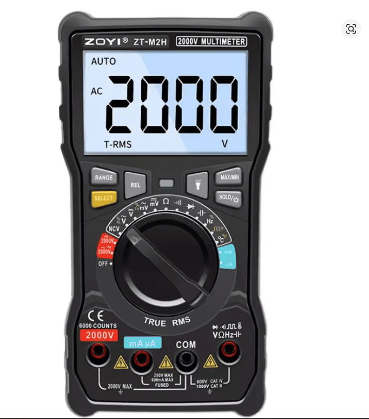 مولتیمتر ZOYI ZT-M2H، ابزاری پیشرفته با شمارش ۶۰۰۰ (6000 counts) و قابلیت اندازهگیری ولتاژ تا ۲۰۰۰ ولت AC/DC است.