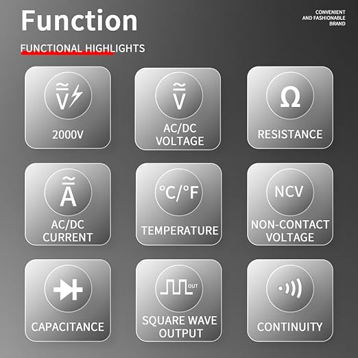 طیف کامل اندازهگیری: ولتاژ AC/DC، جریان، مقاومت، خازن، فرکانس، تست دیود/پیوستگی.